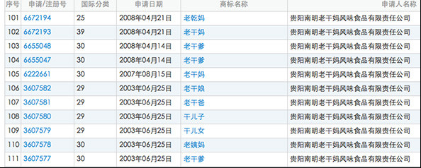 和阿里巴巴類似,公眾熟知的油制辣椒品牌“老干媽”所有者貴陽(yáng)南明老干媽風(fēng)味食品有限責(zé)任公司,還注冊(cè)了“老干爹”、“老干娘”、“老干爸”、“干兒子”、“干兒女”、“老姨媽”等商標(biāo)。