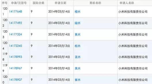 小米科技有限責(zé)任公司注冊(cè)了“大米”、“藍(lán)米”、“黑米”、“紫米”、“橙米”、“綠米”、“黃米”、“桔米”等商標(biāo).