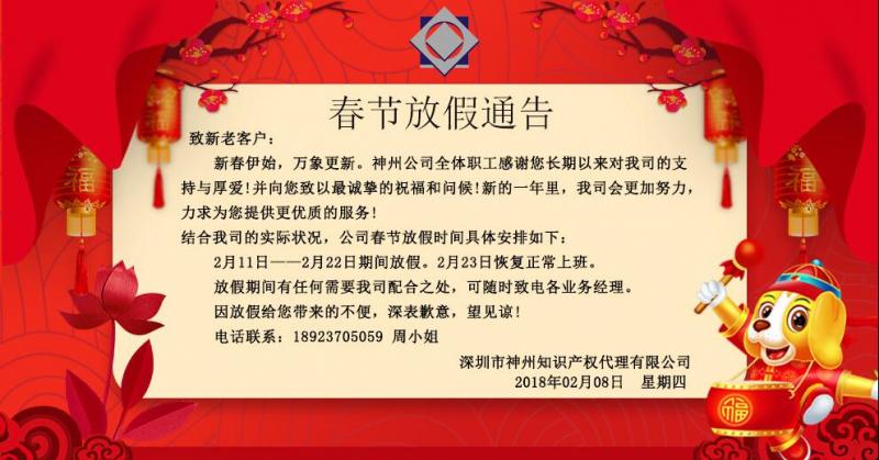 2018年神州知識產(chǎn)權(quán)春節(jié)放假通知