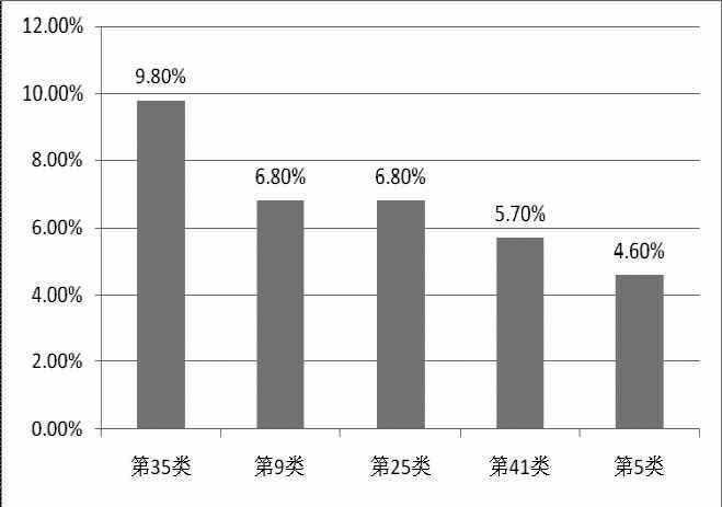 從上圖可以看出,第35類的申請量遠遠高于排名第二的第9類及第25類的申請量,事實勝于雄辯,第35類在全球申請量排名第一,所以作為我們中國企業(yè),對于第35類的保護也一樣要重視起來。